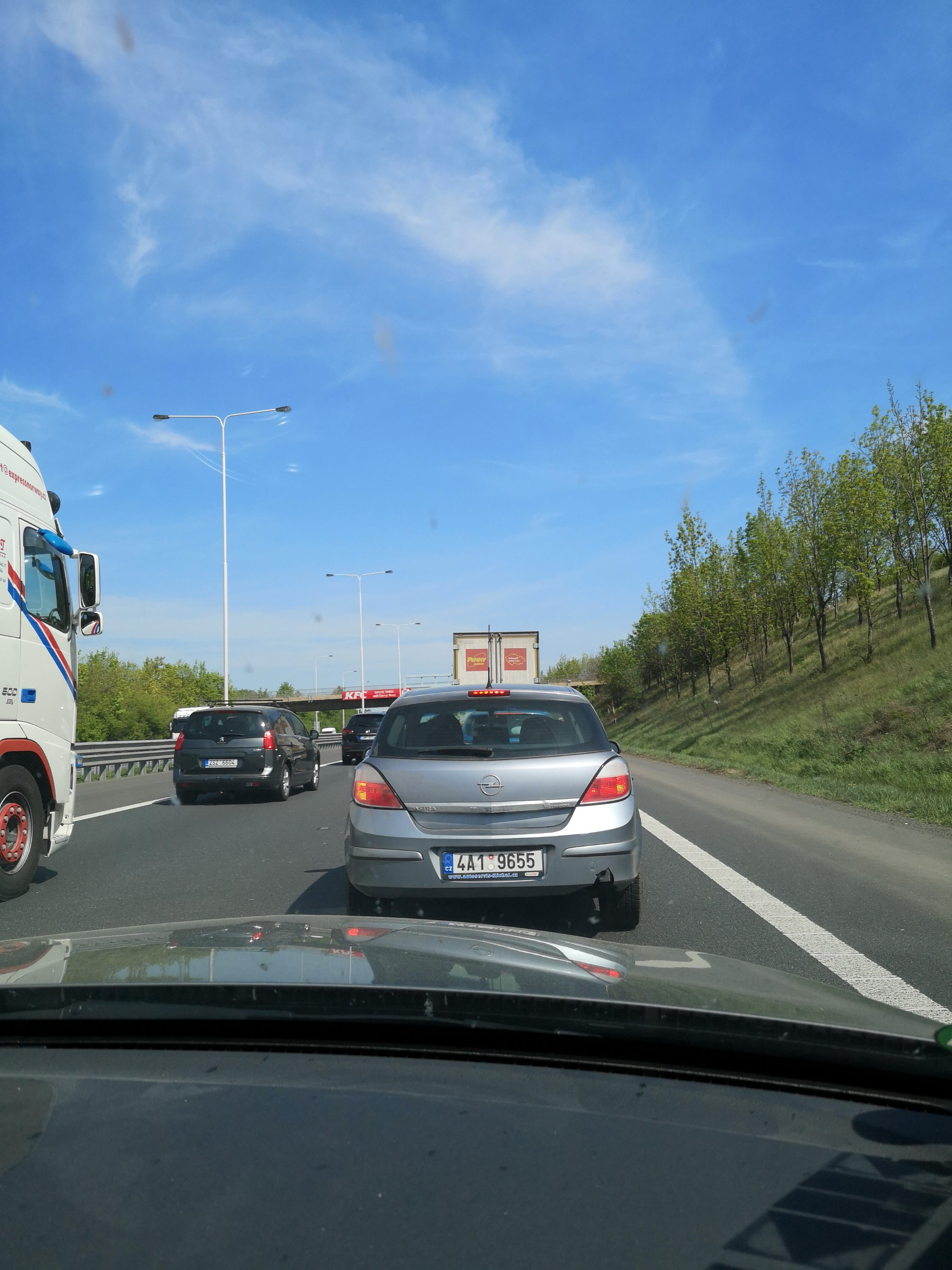 Endlich auf der Autobahn bei Pilsen und es geht nun voran mit 150kmh. Bis jetzt alles frei und sehr wenig Verkehr, aber wir. Kommen ja noch an Prag vorbei.